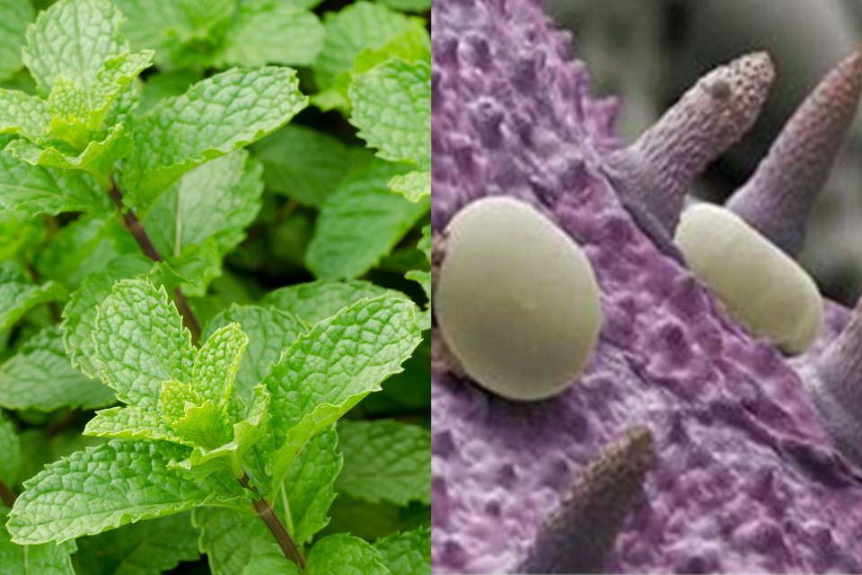 Például lásd az alábbi fotókon a borsmenta levelét és a levélről készült mikroszkopikus felvételeket. A jobb oldali felvételeken látható kis halványsárga zsákocskák maguk az illóolajok.